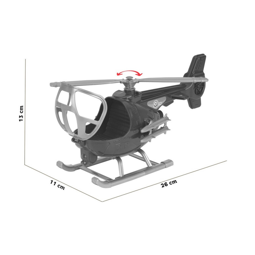 Швидкий і маневровий вертоліт входять до складу військово-повітряних сил. Потужний гвинт і великі шасі надають іграшці стійкості. До фюзеляжу рятувального гелікоптера прикріплені баки або контейнери з корисним вантажем. Кабіна відкривається, у ній зручно розмістити фігурку пілота або улюблену іграшку. Вертоліт прикрашений яскравою патріотичною наклейкою.